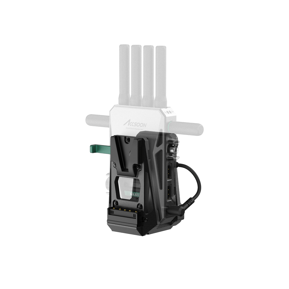 CineView Master 4K hoặc CineView 2 SDI được giữ chặt trong bộ chuyển đổi và cấp nguồn qua cáp DC ngắn. Nguồn từ pin V-lock truyền đến máy quay. Bộ chuyển đổi làm từ hợp kim nhôm, bền và nhẹ, nặng 293g