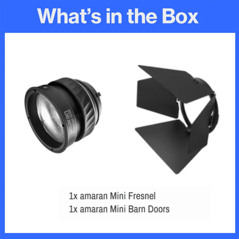 Amaran Mini Fresnel with Mini Barn Doors KIT là một bộ đèn Fresnel siêu nhỏ gọn, có gắn kèm cửa điều chỉnh ánh sáng (Mini Barn Doors). Sản phẩm được thiết kế để gắn trên đèn amaran Ray 60c và 120c thông qua chuẩn Bowens.