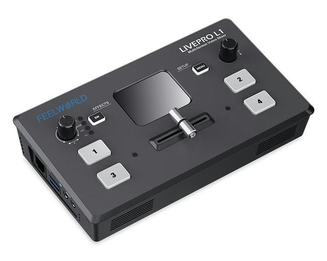 Bàn trộn Livestream FeelWorld LIVEPRO L1 V1 là một thiết bị trộn video và chuyển đổi được thiết kế cho việc phát trực tiếp. Nó có bốn cổng vào HDMI, kết nối USB 3.0, và màn hình LCD.