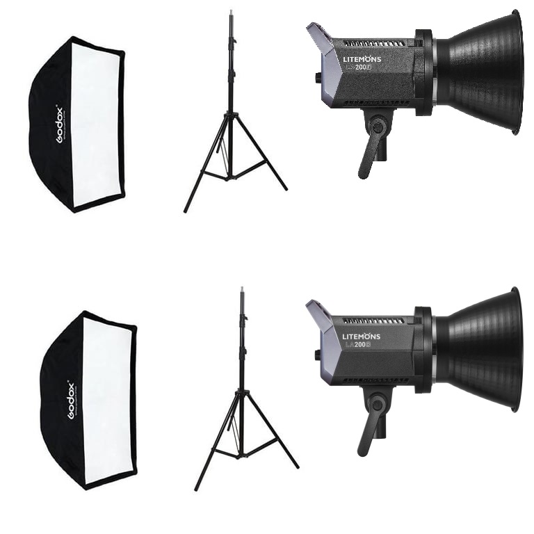 Bộ sản phẩm bao gồm 2 đèn LED Godox Litemons LA200D, 2 softbox Godox kích thước 60x90cm và 2 chân đèn hợp kim nhôm cao 2.88m. Giá cả đã được giảm mạnh so với giá gốc.