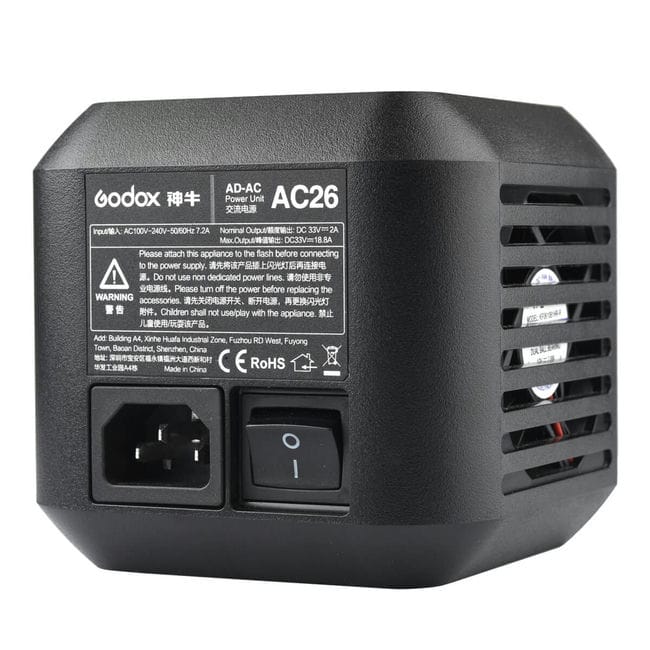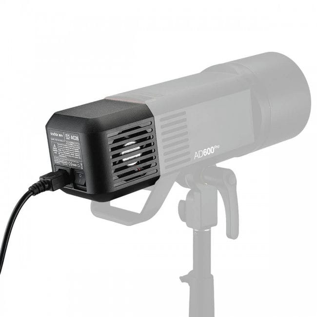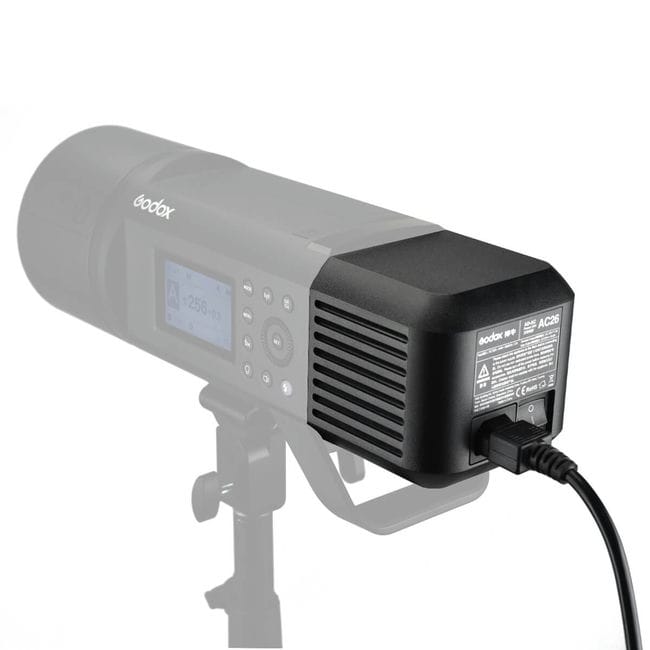 Bộ chuyển đổi nguồn Godox AC26 cho AD600Pro/ AD600Pro II cho phép kết nối đèn với ổ cắm tường thay vì sử dụng pin sạc, giúp gia tăng thời gian hoạt động đèn trong các buổi chụp ảnh trong studio mà không lo hết pin.
