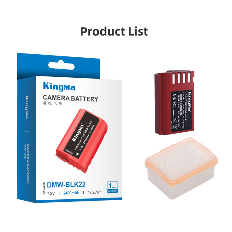 Pin KingMa DMW-BLK22 có dung lượng 2400mAh, được thiết kế đặc biệt để tương thích với các máy ảnh Panasonic như DC-S5, G9, GH5, GH5S, GH6, GH7. Sản phẩm này mang đến hiệu suất ổn định và đáng tin cậy, giúp người dùng có thể chụp hình và quay video liên tục mà không lo lắng về việc hết pin.