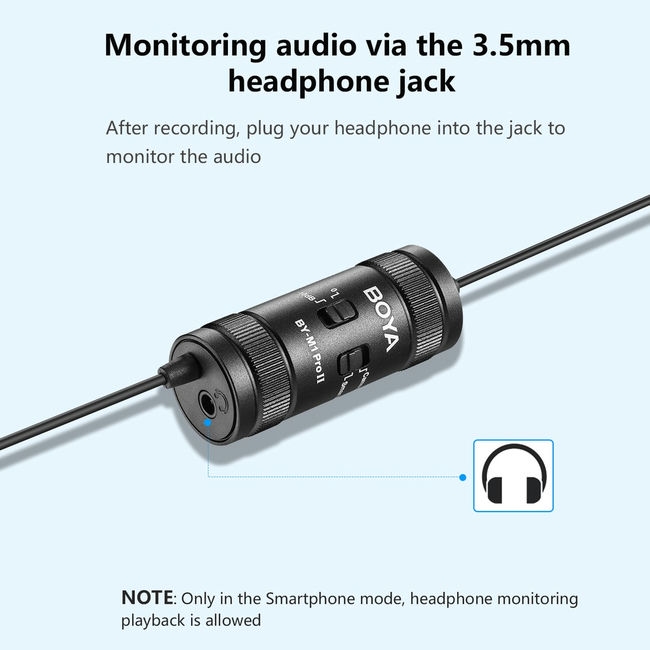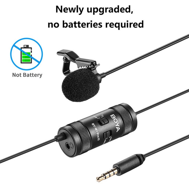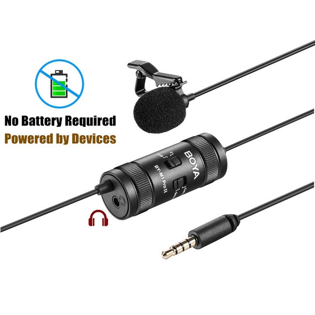 Boya BY-M1 Pro II 3.5mm, một thiết bị ghi âm linh hoạt có thể sử dụng cho nhiều loại thiết bị như điện thoại thông minh, máy quay phim, máy ghi âm và máy tính xách tay.
