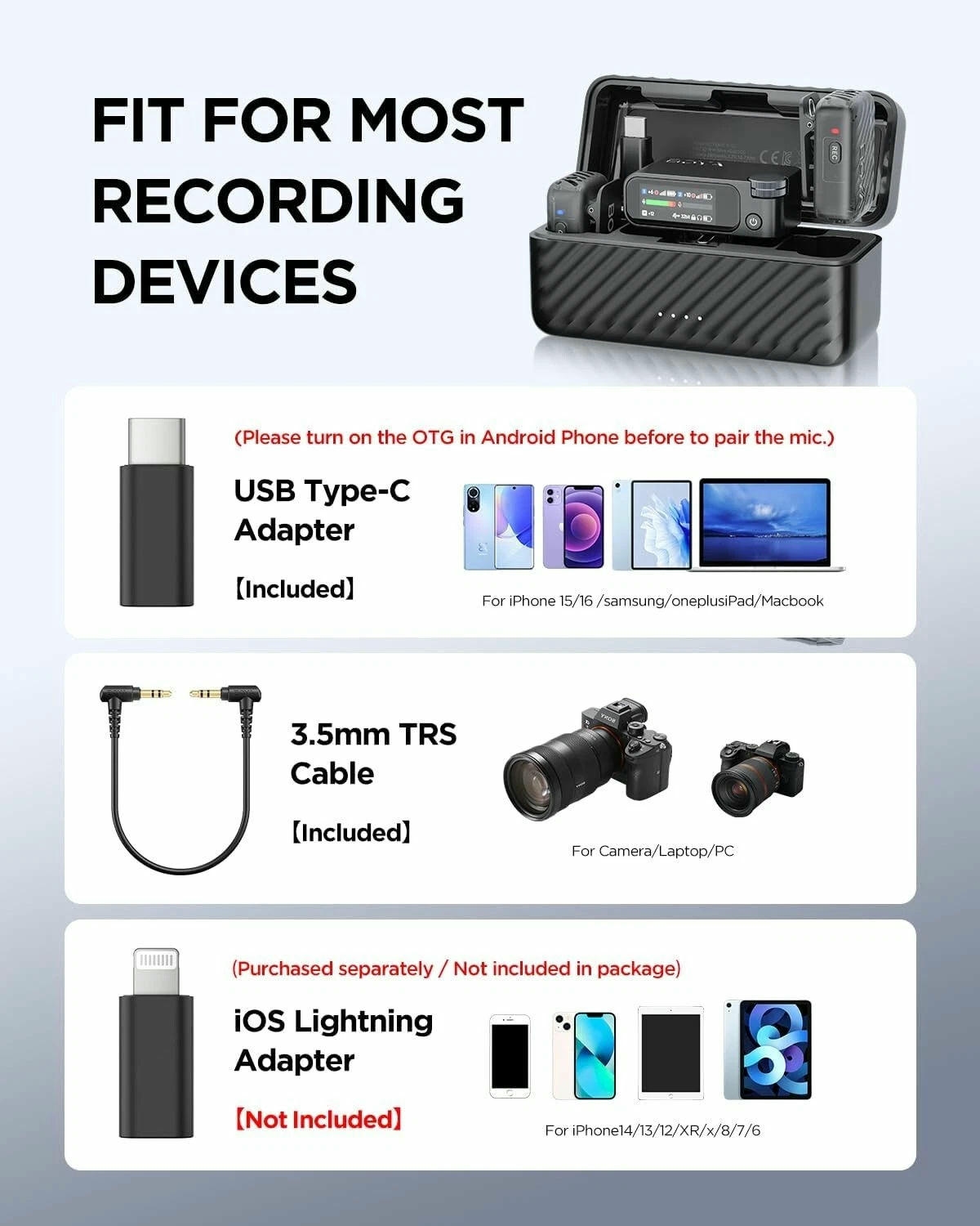 | Kiểu micro | Microphone Lavalier không dây, USB-C |