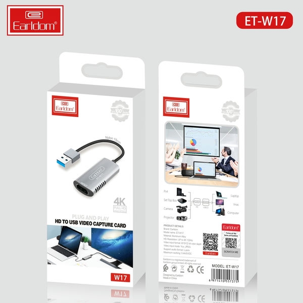 Thiết bị này hỗ trợ kết nối HDMI và chuyển đổi sang cổng USB 3.0, cho phép người dùng truyền tải nhanh chóng hình ảnh và âm thanh chất lượng cao.Được bán trên nhiều trang thương mại điện tử, cửa hàng và hiện nay đang được phân phối tại hl studio – thiết bj quay phim, Earldom ET-W17 được đánh giá cao với các xếp hạng tích cực từ người dùng.