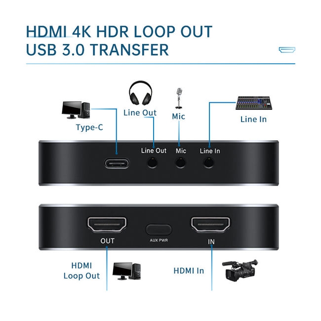 - 🚀 Mặt trước có HDMI in, AUX PWR, HDMI out, mặt sau có USB Type-C, Line Out, Mic In, Audio Line In.
