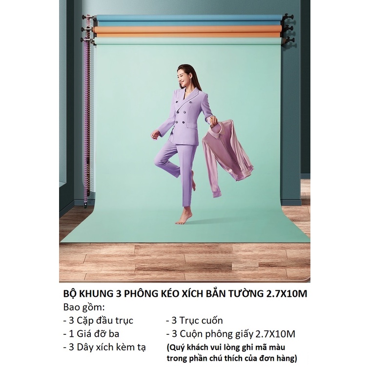 Combo bộ treo 3 phông xích + 3 phông giấy 10m với thiết kế đơn giản dễ lắp đặt và sử dụng, việc thu hạ thông qua sợi xích tay kéo. Bộ cuốn 3 phông phù với với studio cố định ít di chuyển, phông giấy là loại phông mà chất liệu rất thân thiện với môi trường, màu sắc tươi sáng, bề mặt mịn đẹp, cho những bức ảnh, những cảnh quay được chân thật và sắc nét nhất. Sản phẩm hiện đang có mặt trên thị trường bởi thietbiquayphim.com với giá tốt nhất hiện nay.
