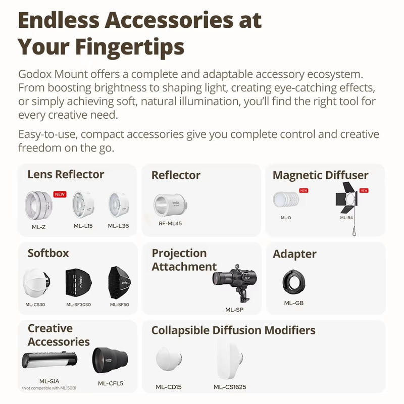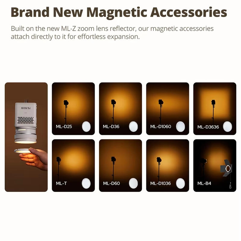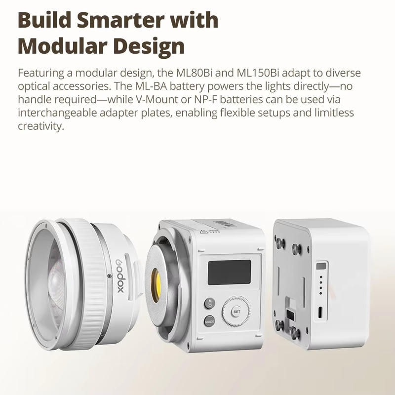 Đèn ML80Bi và ML150Bi sở hữu thiết kế mô-đun linh hoạt, dễ dàng tương thích với nhiều phụ kiện quang học khác nhau. Đèn có khả năng chiếu sáng cao nhờ ống kính zoom ML-Z mới, cùng hệ thống phụ kiện từ tính dễ dàng mở rộng. Với nhiều tùy chọn pin không dây và điều khiển qua app NFC, đây là giải pháp chiếu sáng di động phù hợp cho cả quay phim trong nhà và ngoài trời.