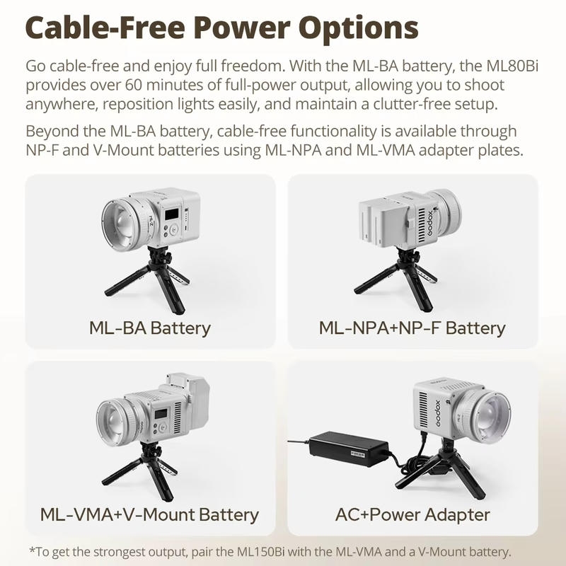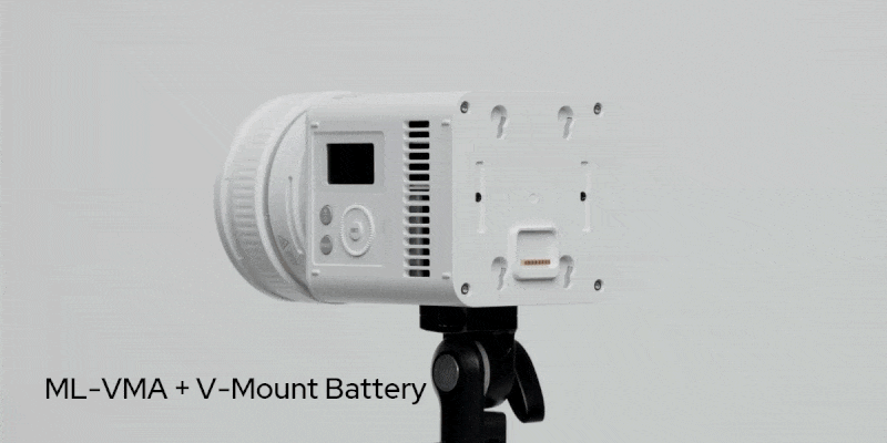 - Tùy chọn pin không dây: Pin ML-BA cho 60 phút chiếu sáng liên tục; hỗ trợ pin V-Mount và NP-F với adapter.
