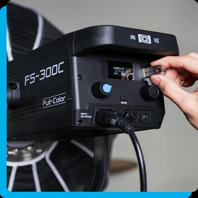 FS-300C tương thích với nhiều phụ kiện tiêu chuẩn như softbox và lens, giúp mở rộng khả năng sáng tạo. Sản phẩm cũng có thể nâng cấp firmware qua cổng USB để tối ưu hóa hiệu suất.