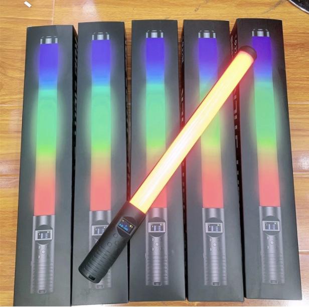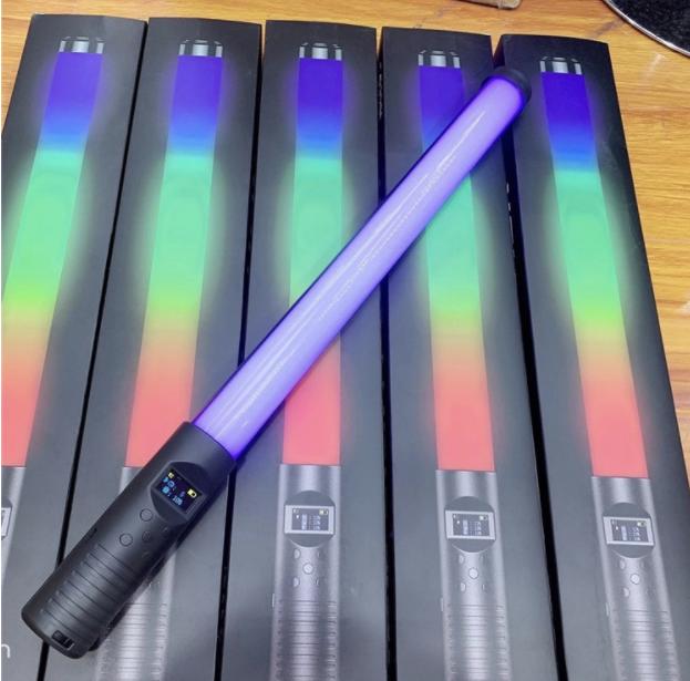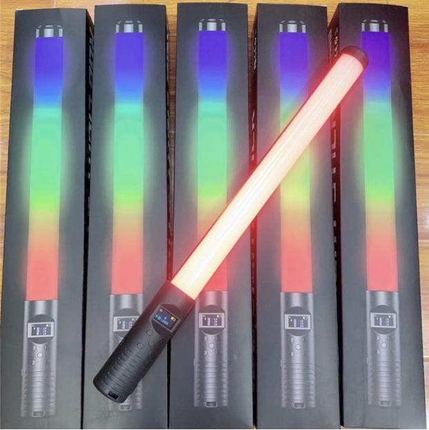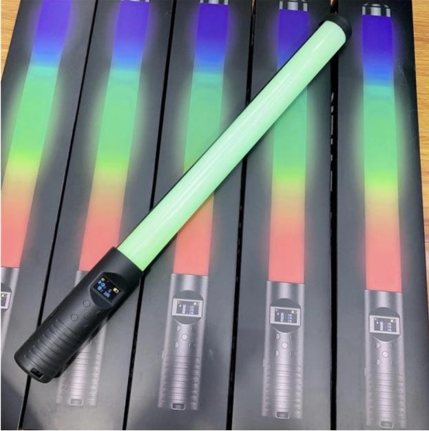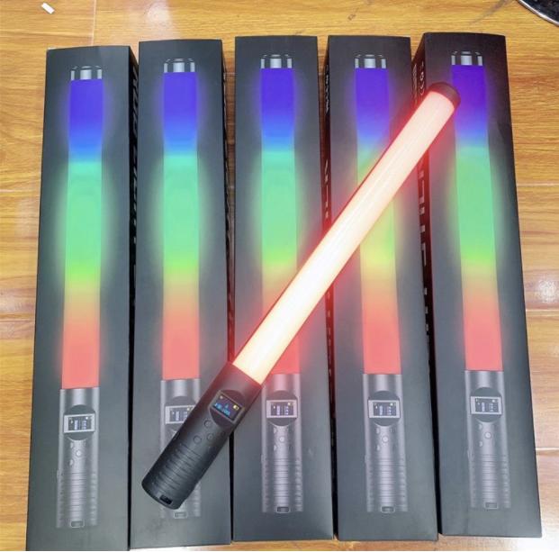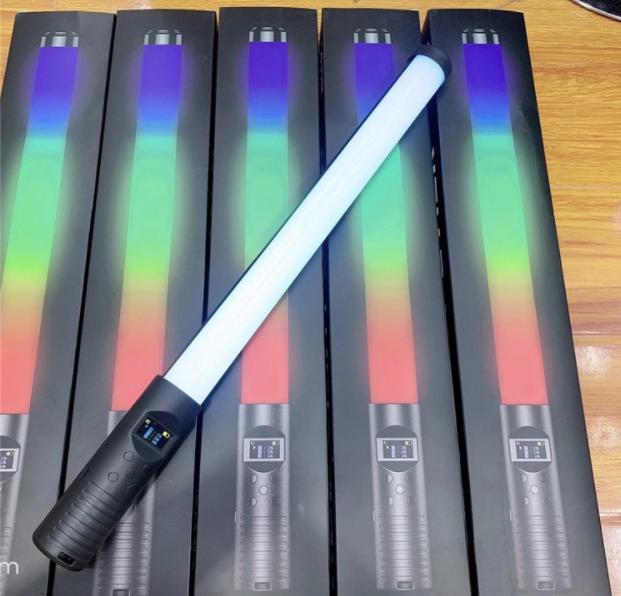 RGB light Stick được thiết kế dạng ống dài khá nhỏ và dễ sử dụng, đèn có một tay cầm tiện lợi, ngay trên phía tay cầm là một màn hình led nhỏ hiển thị chế độ màu, độ sáng, pin..v.v…và cũng ở phần tay cầm đó có các nút điều khiển đèn giúp bạn dễ dàng điều chỉnh đèn hơn.