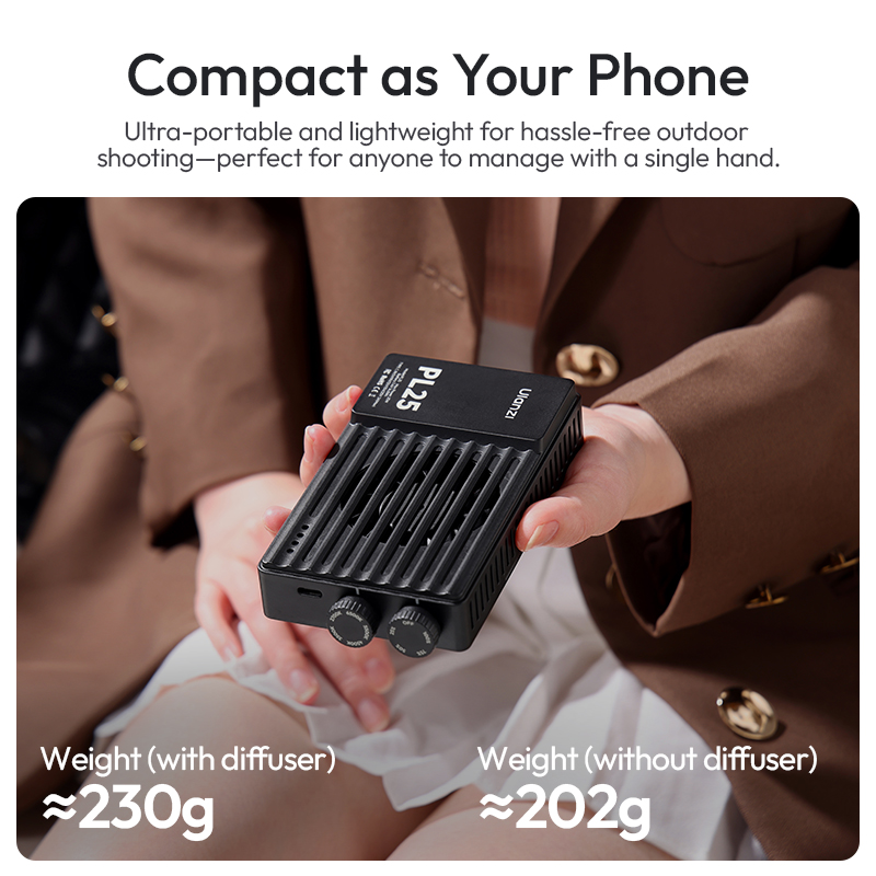 - Thiết kế cầm tay gọn nhẹ, công suất mạnh mẽ 25W phù hợp cho quay chụp trong nhà và ngoài trời.
