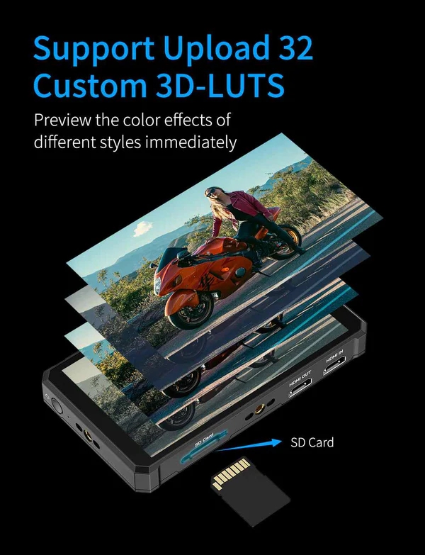 - Hỗ trợ tải lên đến 32 bảng màu 3D LUT (.cube file) qua thẻ SD để xem trước màu sắc khi quay phim.