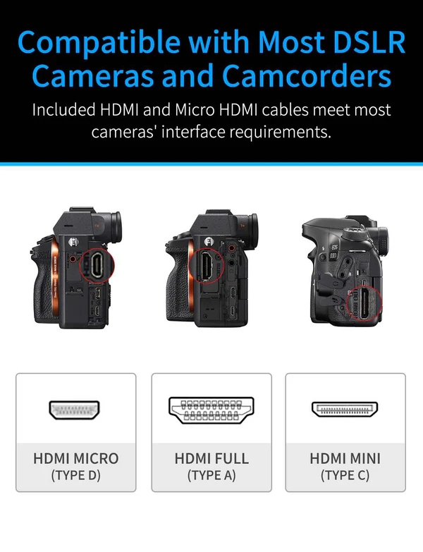 - Hỗ trợ hầu hết các máy quay DSLR, mirrorless và thiết bị phát video có cổng HDMI.