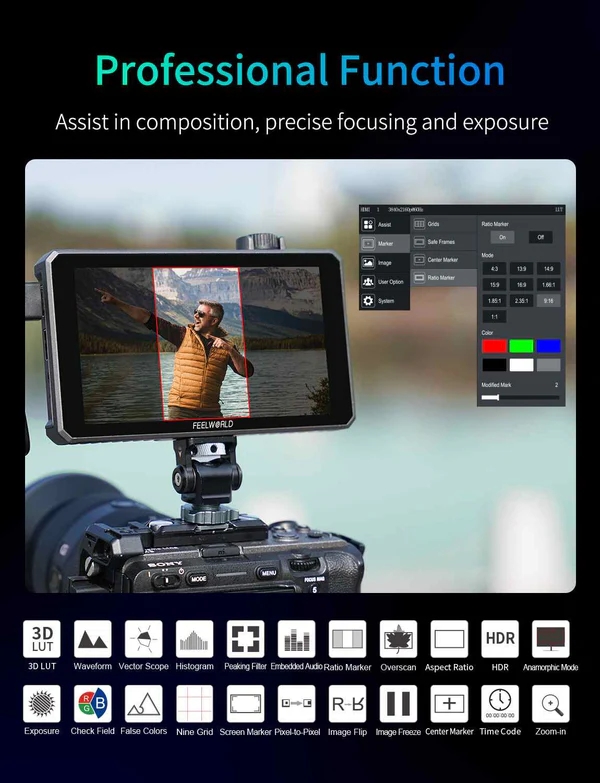 FEELWORLD SC6 là màn hình camera DSLR chuyên dụng có kích thước 6 inch với độ sáng cao 1500 nit, phù hợp để sử dụng ngoài trời trong điều kiện ánh sáng mạnh.