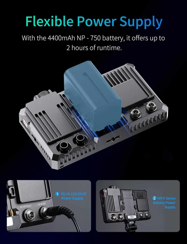 - Nguồn pin: Dùng pin NP-F series phổ biến trên thị trường hoặc nguồn DC qua adapter phù hợp.