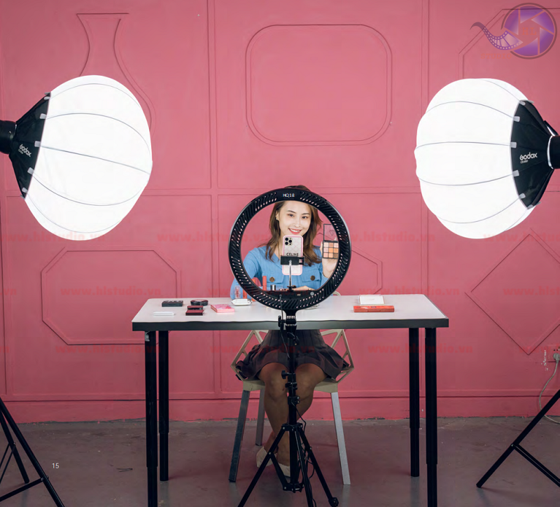 - Vị trí 3: Đặt 1 đèn Led Ring HQ18 ở phía chính diện giúp lấp đầy ánh sáng cho mặt trước của MC và tạo ra 1 hình đèn tròn trong mắt.