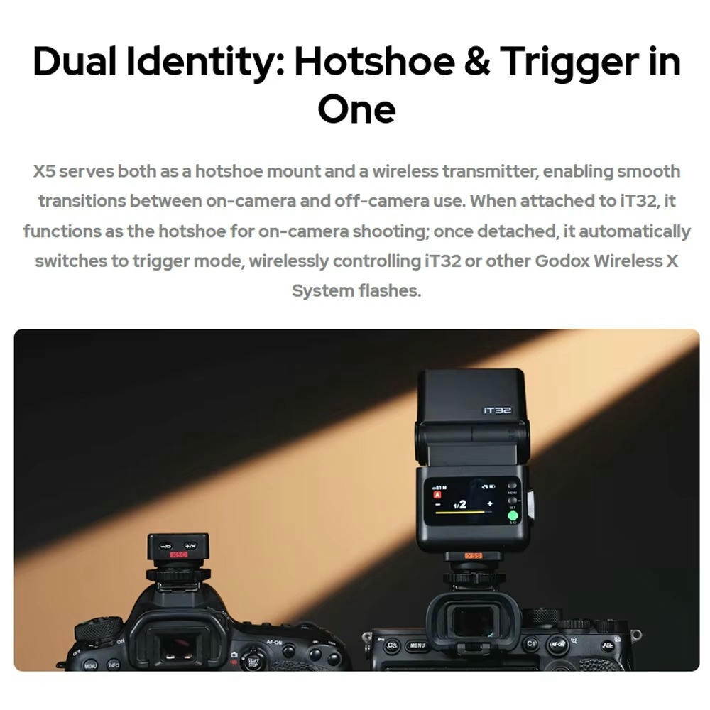 Godox X5 là thiết bị kích đèn flash đa năng, kết hợp vừa là hotshoe vừa là bộ kích không dây TTL HSS 2.4G, tương thích với nhiều dòng máy ảnh phổ biến.
