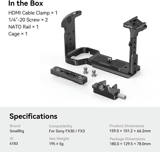SmallRig 4183 là một loại cage máy ảnh được thiết kế để sử dụng cho máy ảnh Sony FX30 và FX3. Cage này được thiết kế để bảo vệ máy ảnh và cung cấp các điểm gắn thêm để tùy chỉnh cấu hình của bạn. Nó cung cấp một khoang gắn NATO rail và một cage hình chữ U. NATO rail được gắn chặt ở phía trên thông qua hai vít 1/4″-20 và có thể tháo ra để lắp đặt các phụ kiện khác.