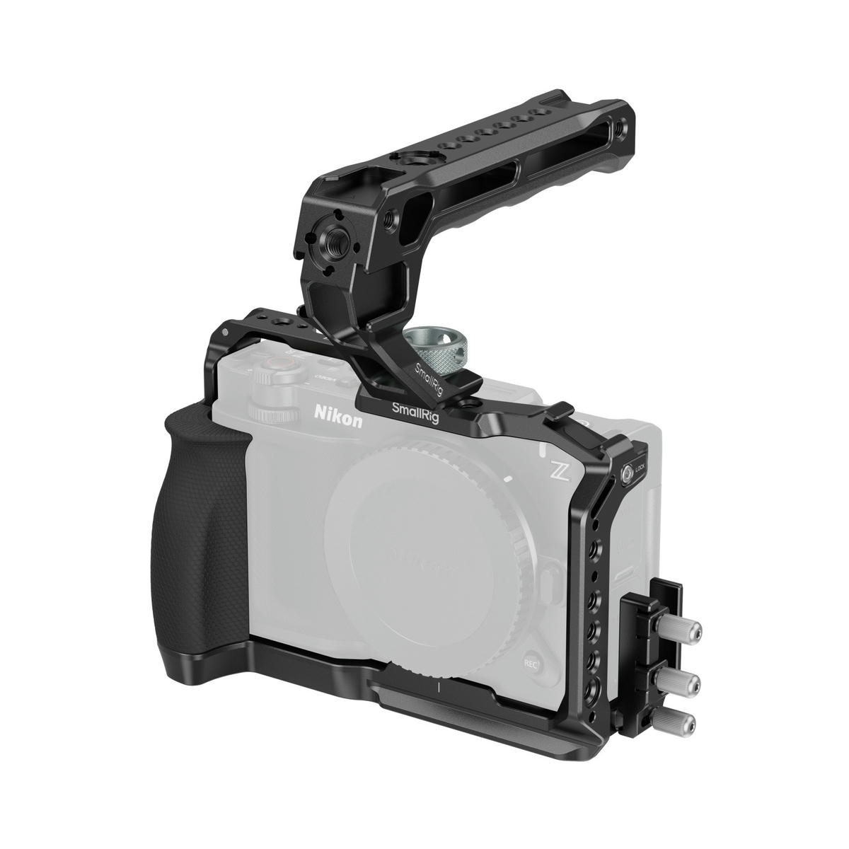 SmallRig Cage Kit cho Nikon ZR 5647 là bộ khung cầm tay chuyên nghiệp giúp di chuyển mượt mà, có tay cầm trên bọc silicone chống trượt và lạnh, kẹp cáp HDMI & USB-C cố định kết nối, cùng nhiều điểm gắn phụ kiện để mở rộng linh hoạt.