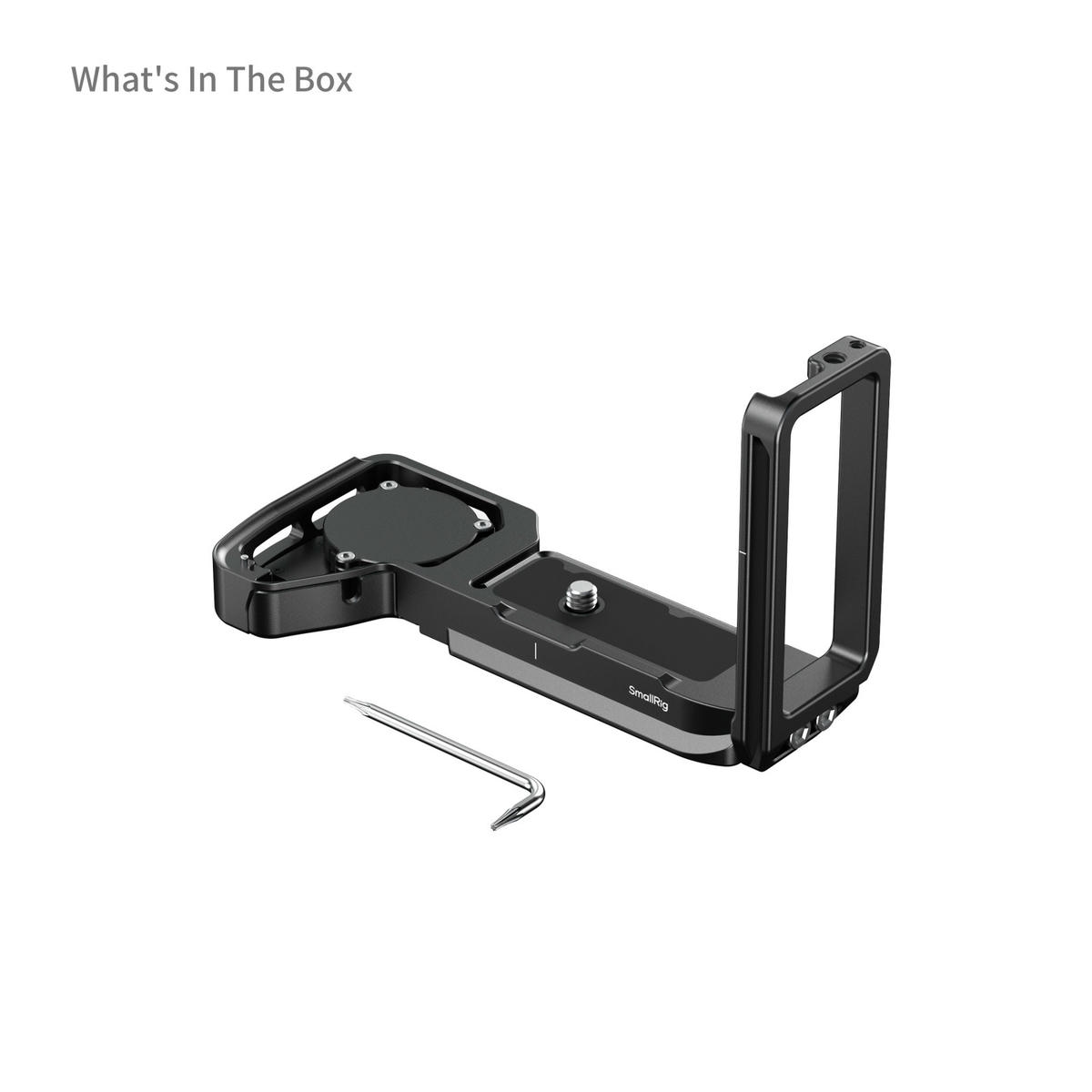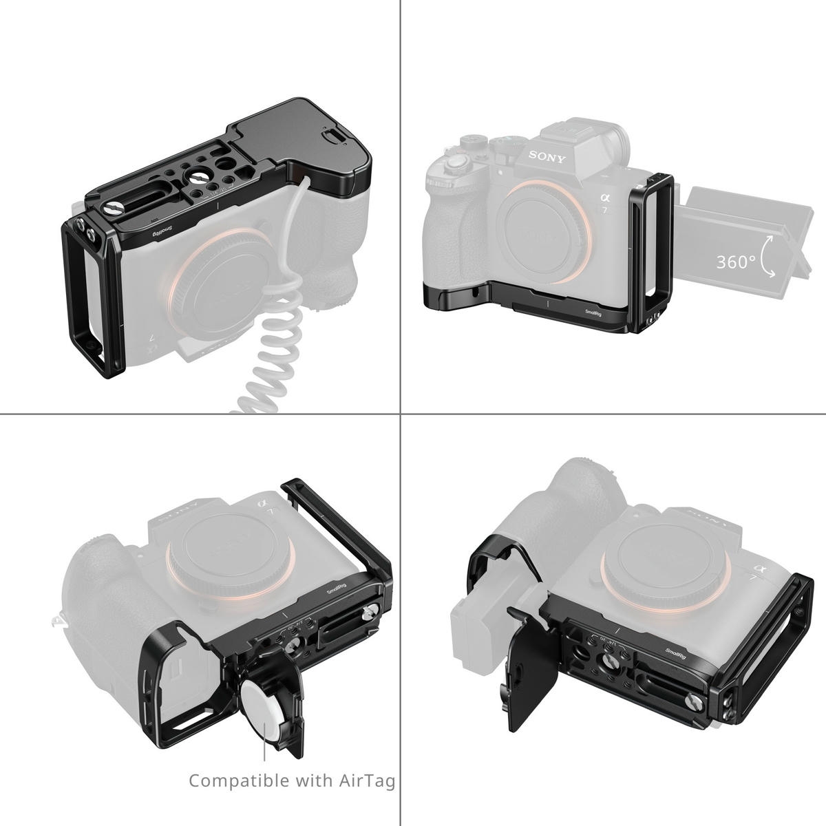 SmallRig 6034 – Đây là một tấm gắn dạng chữ L cho máy ảnh Sony Alpha, có nhiều tính năng hỗ trợ người dùng trong việc thay đổi góc chụp nhanh, theo dõi camera qua AirTag và dễ dàng kết nối với tripod hoặc gimbal.
