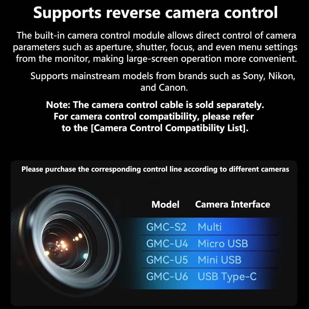 - Hỗ trợ điều khiển trực tiếp máy ảnh (aperture, shutter, focus, menu) với các hãng Sony, Nikon, Canon (cáp điều khiển bán riêng).