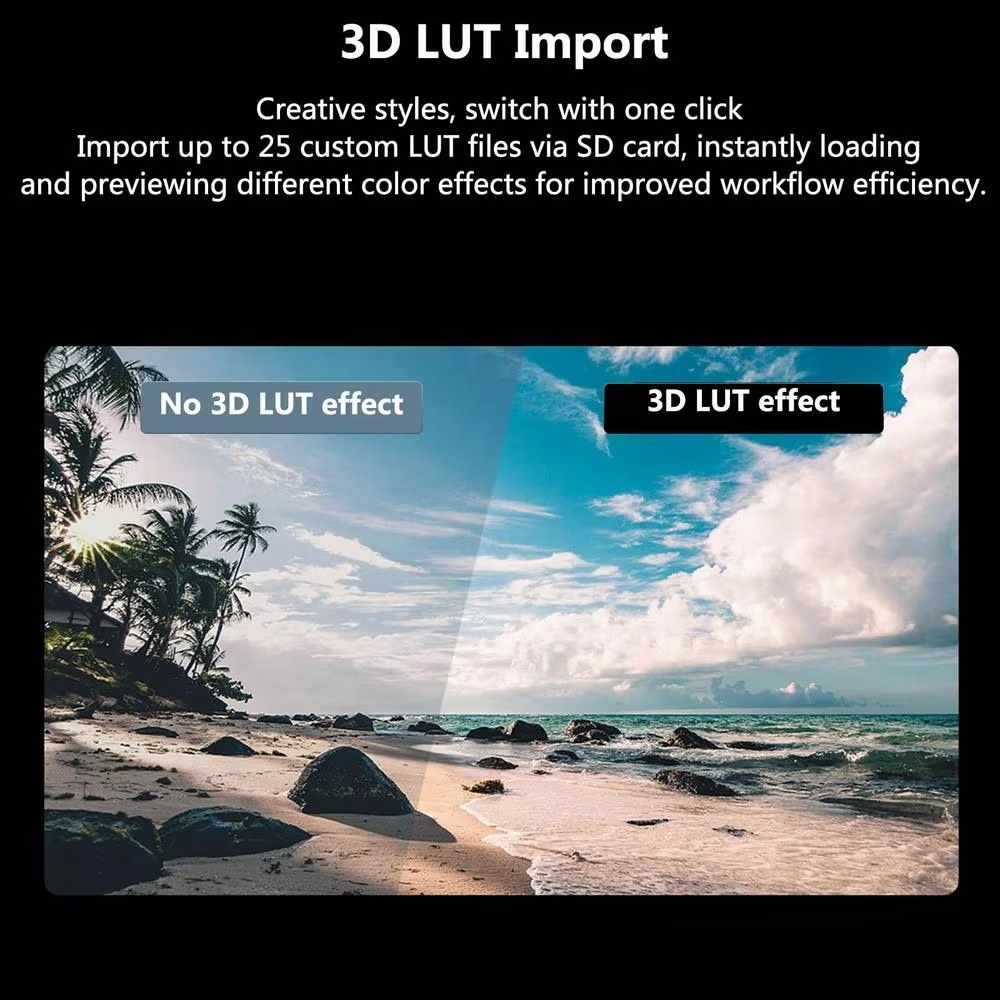 - Hỗ trợ nhập tối đa 25 file LUT tùy chỉnh qua thẻ SD, chuyển đổi nhanh hiệu ứng màu.