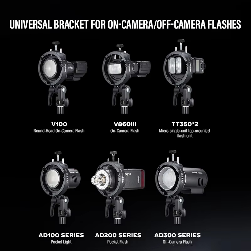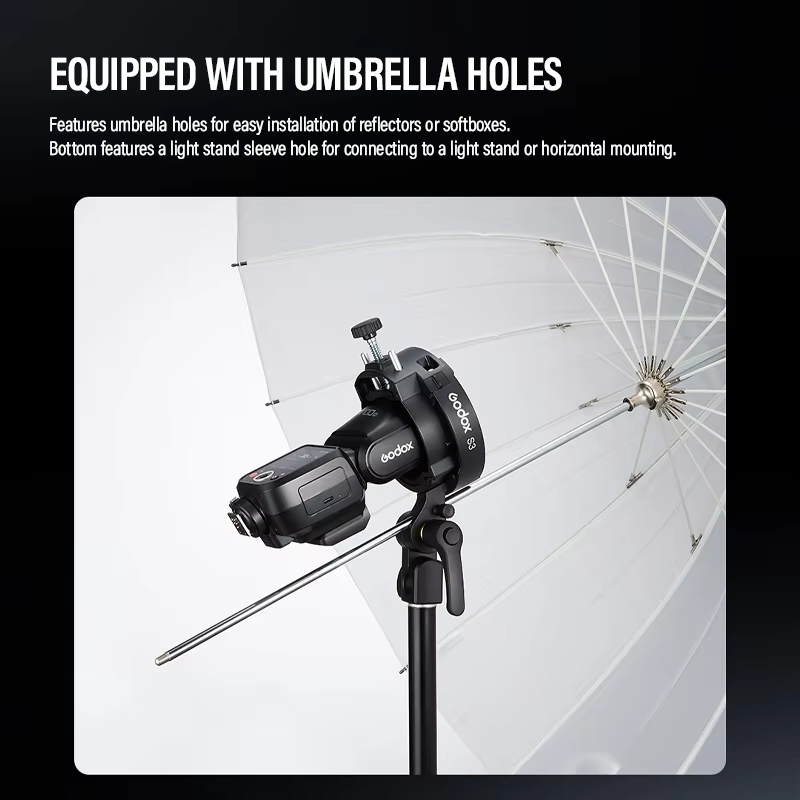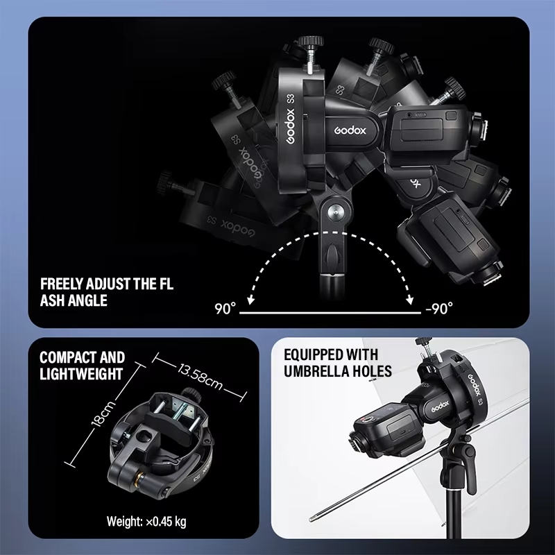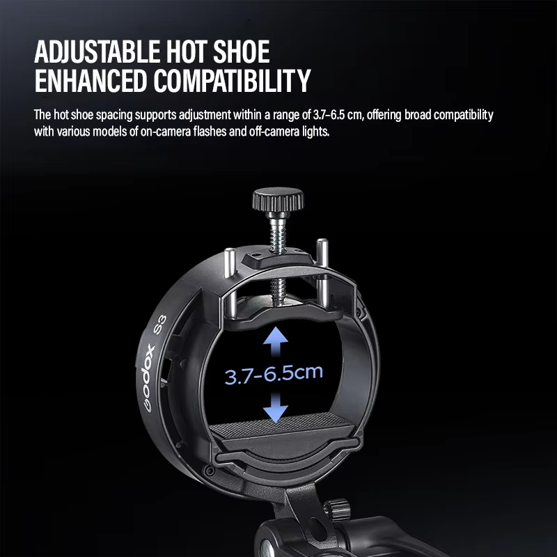 Godox S3 là giá đỡ Speedlite loại S (S-type) với chân gắn Bowens, tương thích với các đèn flash Godox như V100, V860II, AD200, AD300. Đây là phụ kiện hỗ trợ gắn đèn flash ngoài vào các thiết bị chiếu sáng hoặc softbox có chuẩn Bowens.