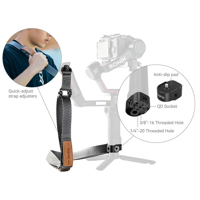 - Dây đeo vai giảm trọng lượng SmallRig tương thích với các loại tay cầm treo (sling handgrip) để giúp giảm thiểu hơn 80% áp lực cho tay và vai người dùng.