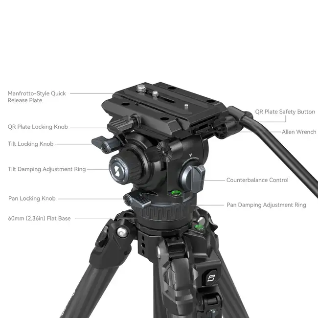- Đầu thủy lực thông minh : Tích hợp hệ thống cân bằng 6 bước và thiết kế tấm gắn tháo lắp nhanh chóng.