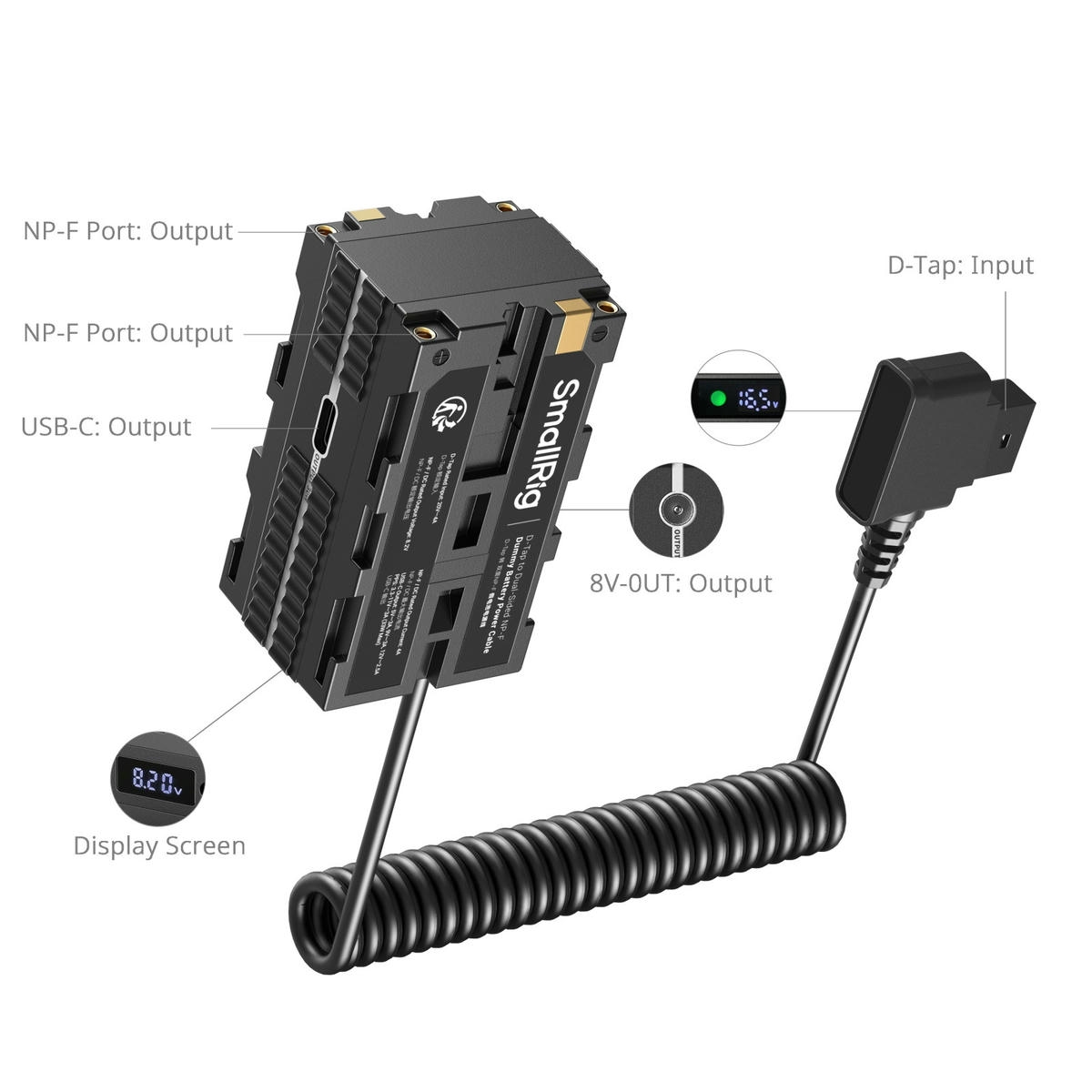 SmallRig D-Tap to Dual-Sided NP-F Dummy Battery Power Cable 4884 là cáp nguồn cho phép cấp điện từ nguồn D-Tap đến hai pin giả NP-F song song với bốn đầu ra, tích hợp màn hình theo dõi và nhiều bảo vệ mạch để sử dụng an toàn và thuận tiện khi quay phim.