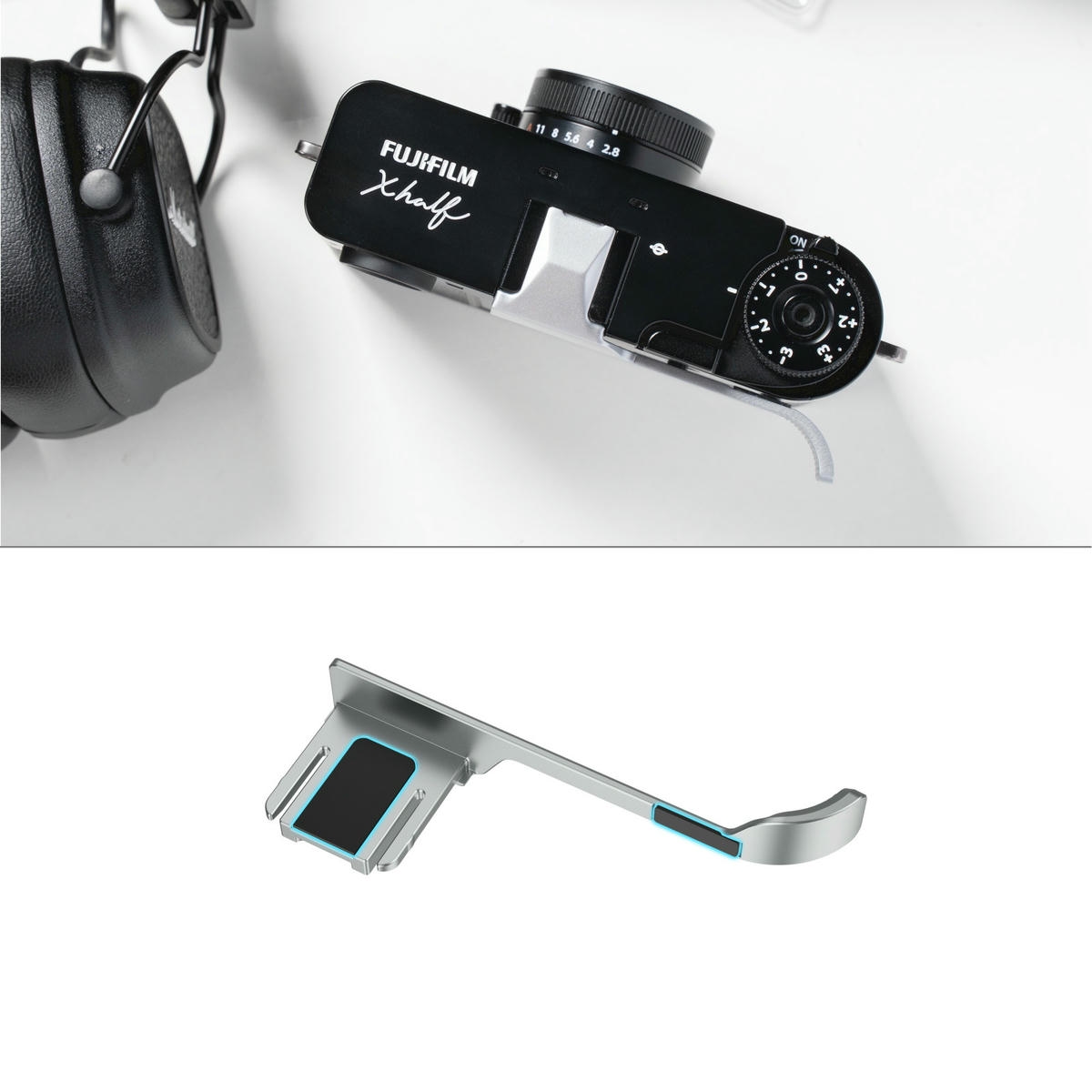 - Hướng dẫn lắp đặt nhanh: Slide thumb grip vào hot shoe của FUJIFILM X half cho tới khi miếng đệm silicone khít; tháo bằng cách kéo nhẹ từ rãnh dành cho ngón tay