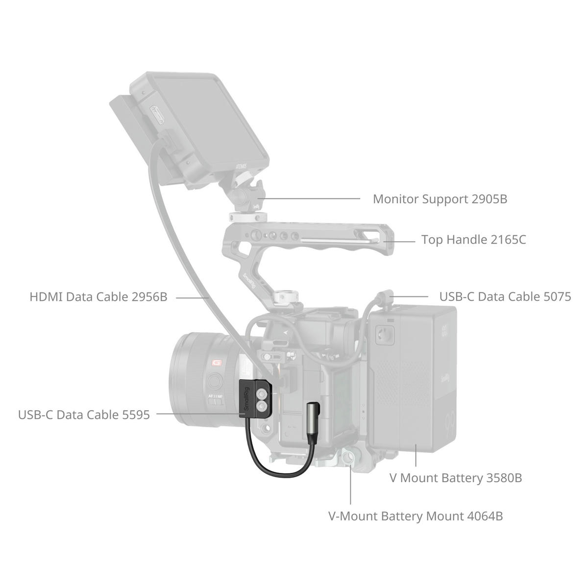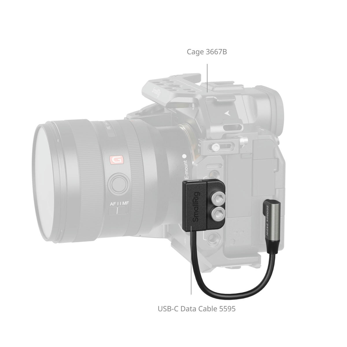 Cáp SmallRig USB-C (Male to Female) 5595 cho phép đặt lại vị trí cổng USB-C khi gắn vào cage hoặc plate chữ L, có đầu nối cái có thể cố định để bảo vệ cổng máy ảnh, và hỗ trợ truyền dữ liệu 20Gbps cùng sạc nhanh 240W.