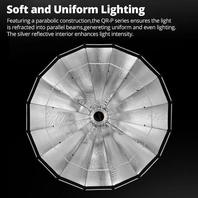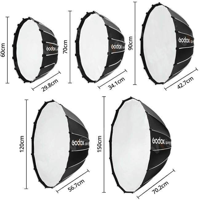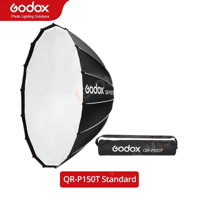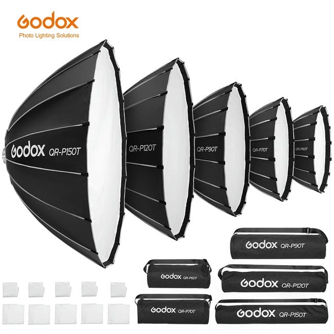 Softbox Godox QR-P60T, QR-P90T và QR-P120T là phần của dòng Softbox Parabolic Quick Release của Godox. Những softbox này được thiết kế với hình dạng parabol giúp lắp đặt và tháo rời nhanh chóng, mang lại ánh sáng mềm mại và đồng đều với đường viền sắc nét.