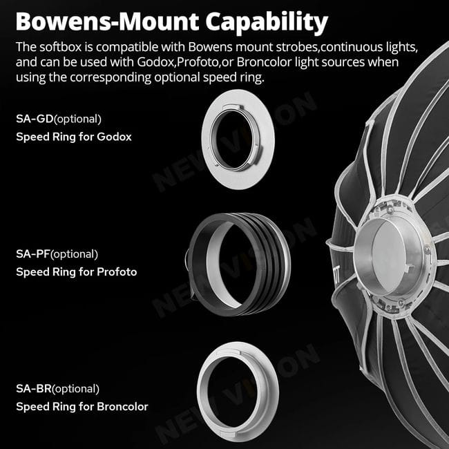 - 🌐 Tương thích rộng rãi với đèn Godox Bowens S mount và có thể sử dụng với đèn Profoto hoặc Broncolor qua speed ring tương thích.