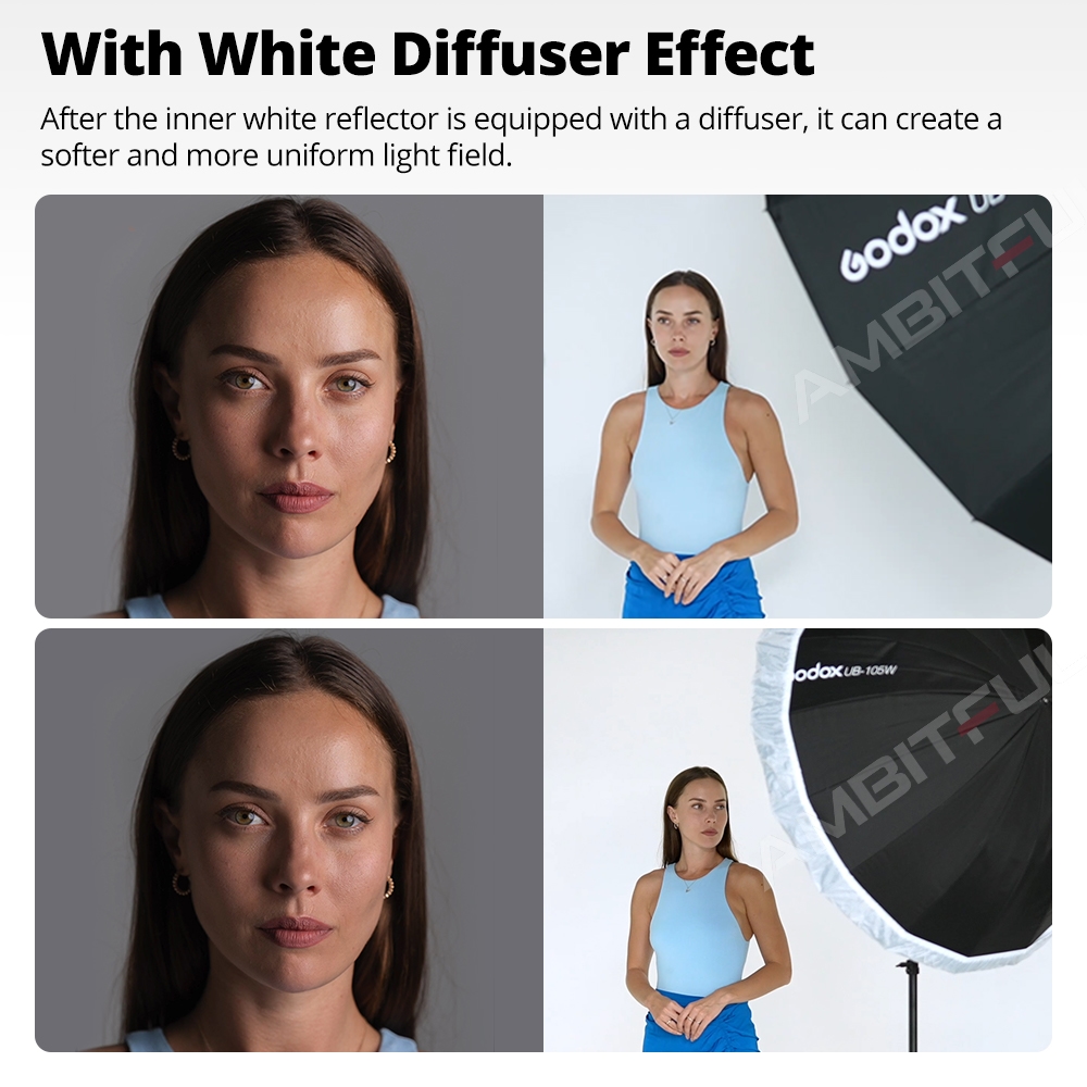 - Chức năng: Khuếch tán ánh sáng (soft diffusion) — làm mềm bóng tối, giảm độ chói, tạo ánh sáng đều, mịn cho chân dung và sản phẩm.