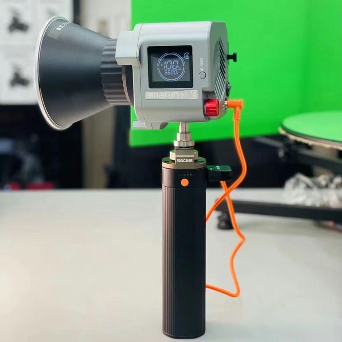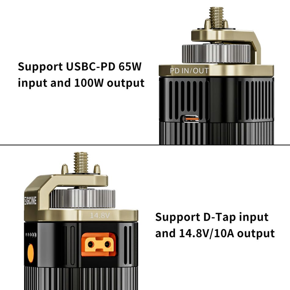 Báng cầm cũng có một cổng đầu ra D-Tap với công suất tối đa 14.8V/10A. Báng cầm pin đa năng này có thể cung cấp nguồn cho đèn qua đầu ra USB-C lên đến 100W hoặc qua cổng đầu ra D-Tap lên đến 148W, mang lại sự linh hoạt trong sử dụng.