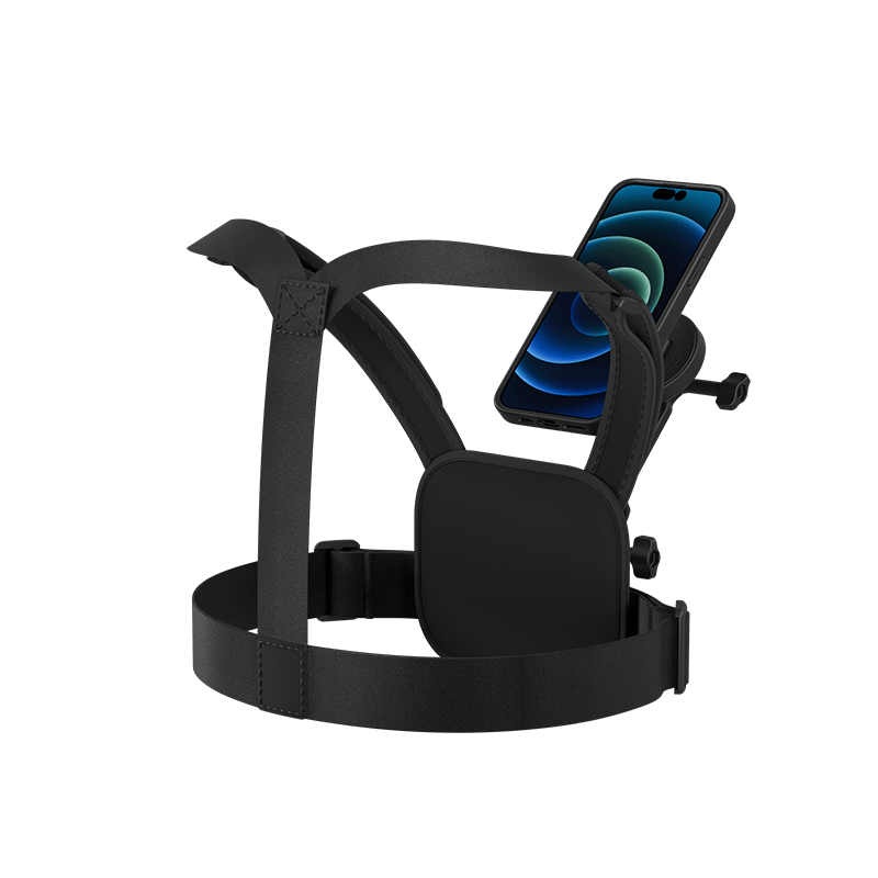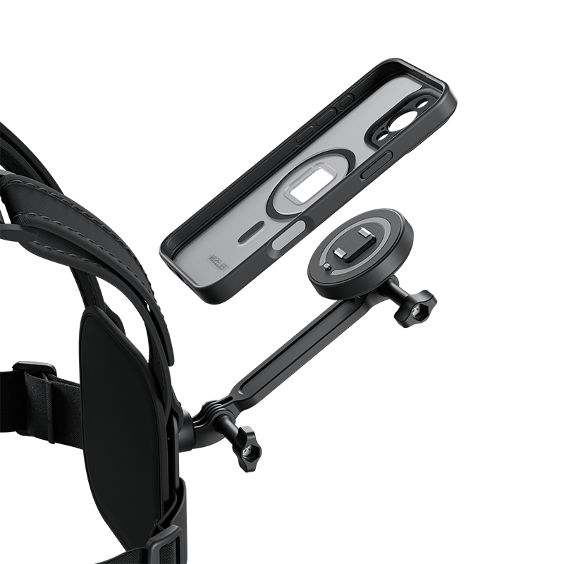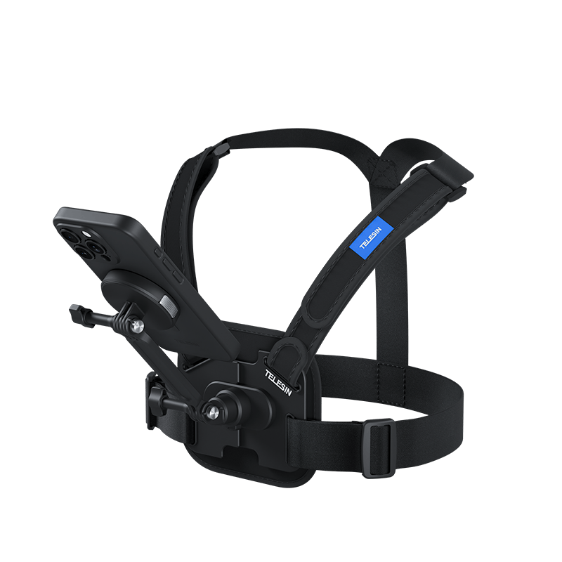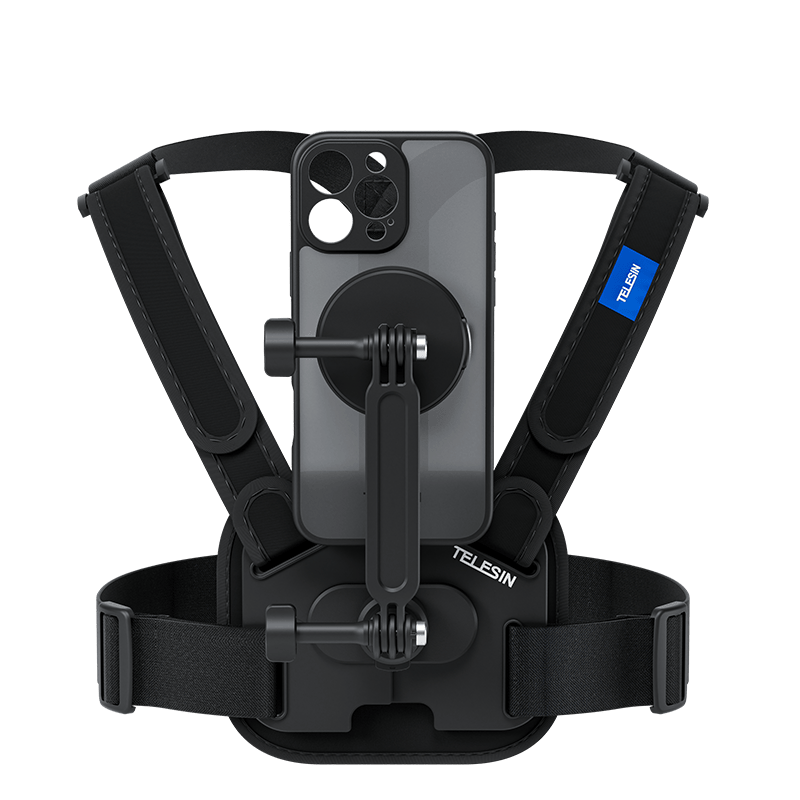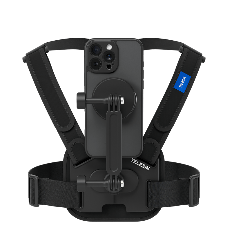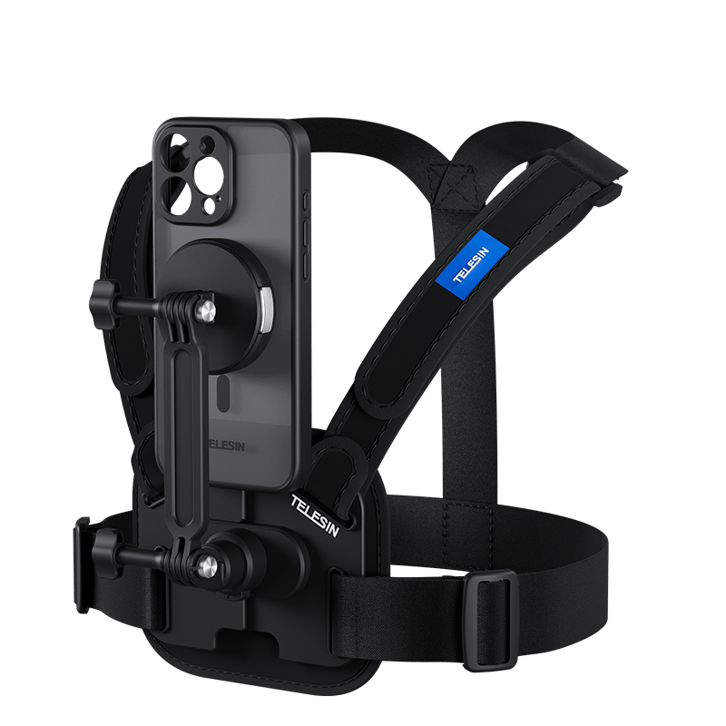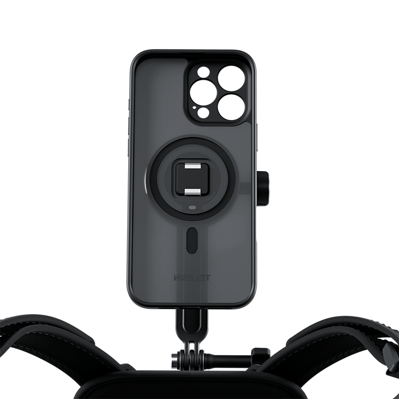 Sản phẩm này là một bộ phụ kiện gắn điện thoại TELESIN dành cho iPhone 16 Pro và Pro Max, bao gồm ốp lưng từ tính và dây đeo ngực thể thao co giãn.