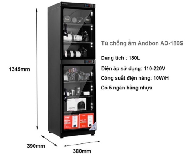 Andbon AD 180S là một sản phẩm được thiết kế để bảo quản các thiết bị nhạy cảm với độ ẩm, như máy ảnh, máy quay, đĩa mềm, băng ghi âm và nhiều thiết bị khác. Với dung tích lên đến 180 lít, tủ này có đủ không gian để đựng nhiều vật phẩm cần bảo quản.