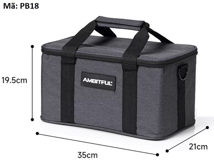 Ambitful PB18: Túi đựng đèn PB18 được thiết kế bằng chất liệu vải Nylon chống thấm cao cấp, có khả năng chống ẩm, bụi, va đập, và thấm nước. Kích thước của túi phù hợp để bảo quản một đèn studio và các phụ kiện kèm theo. Nó được đánh giá cao về tính chất chống sốc và khả năng vận chuyển an toàn.