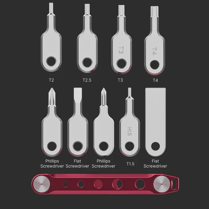 - Bộ Dụng Cụ 9 Trong 1: Bao gồm 2 tua vít đầu dẹt (1.5, 2, 2.5, 3, 4mm) và 2 tua vít đầu chữ thập.