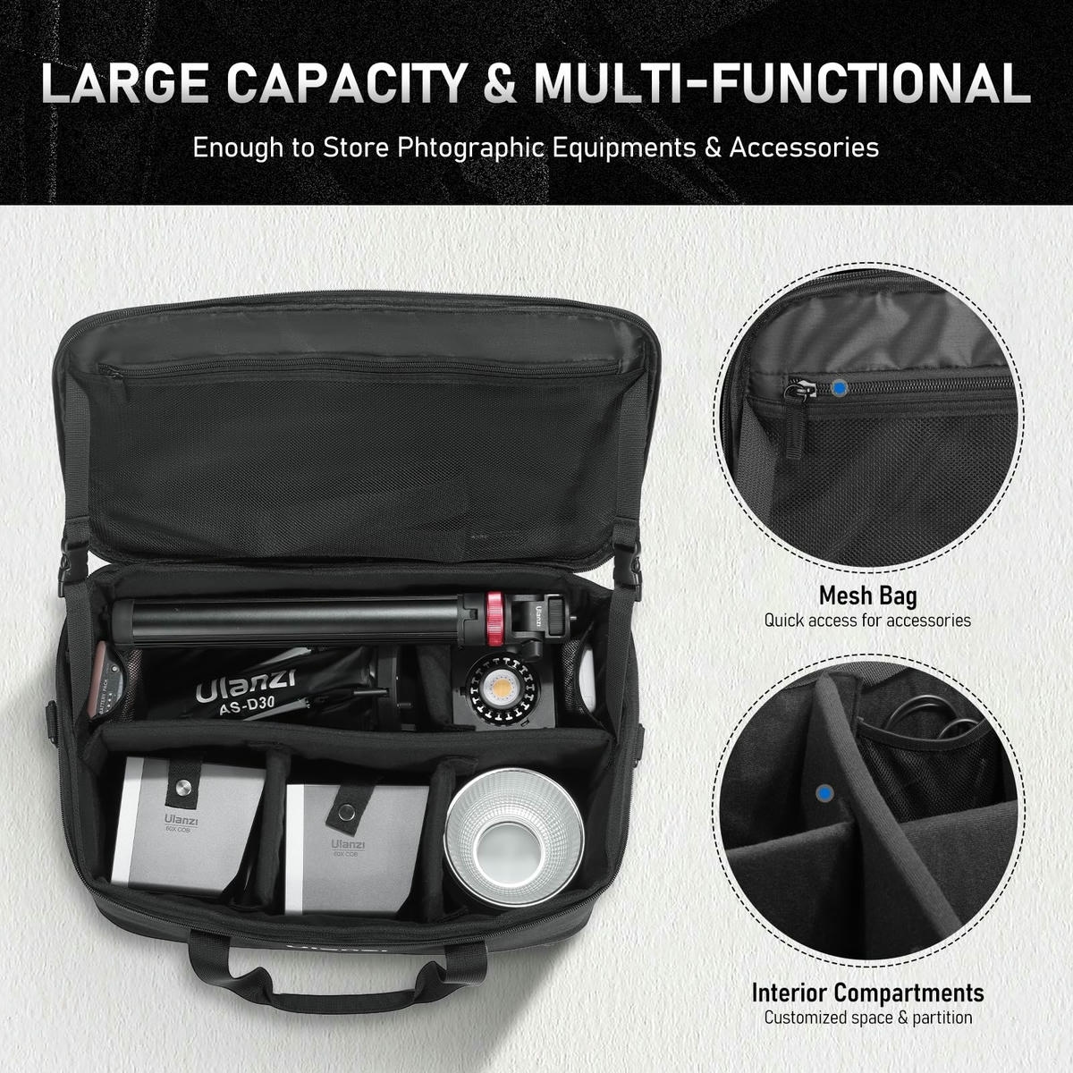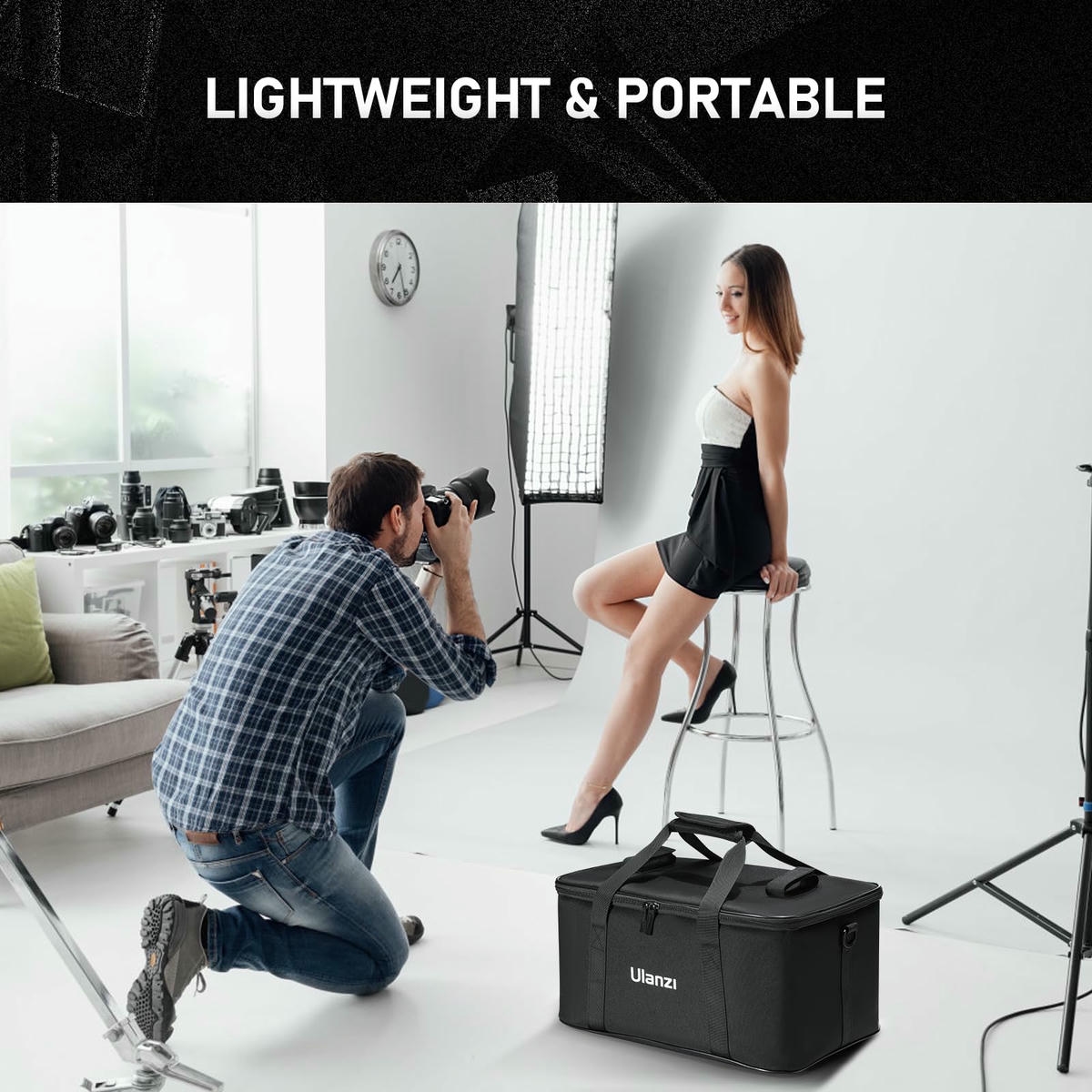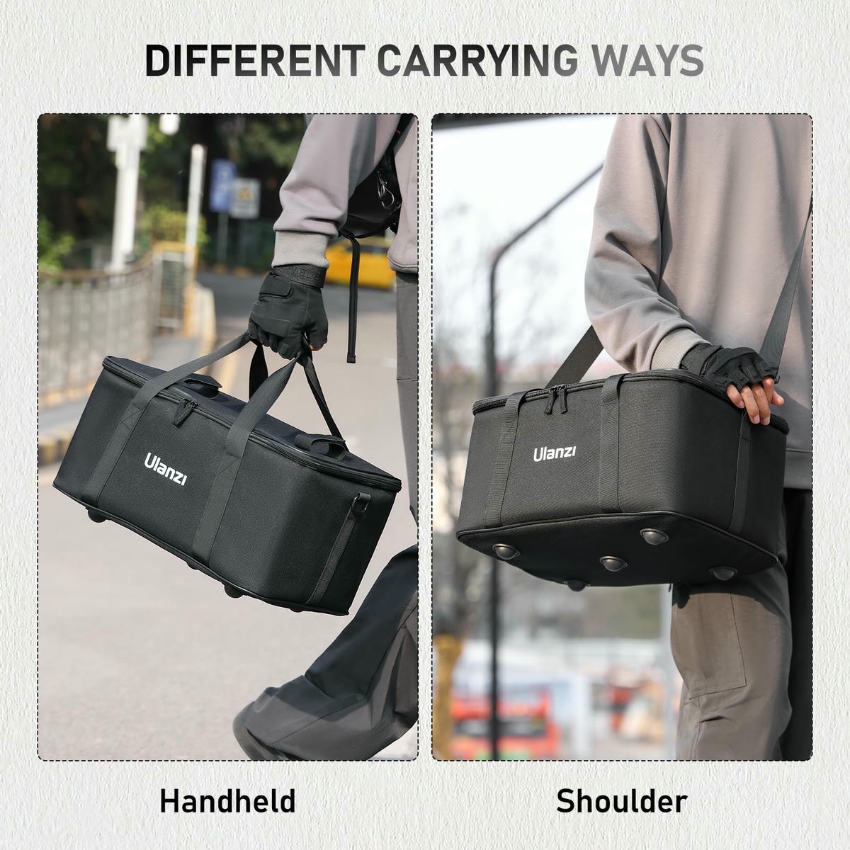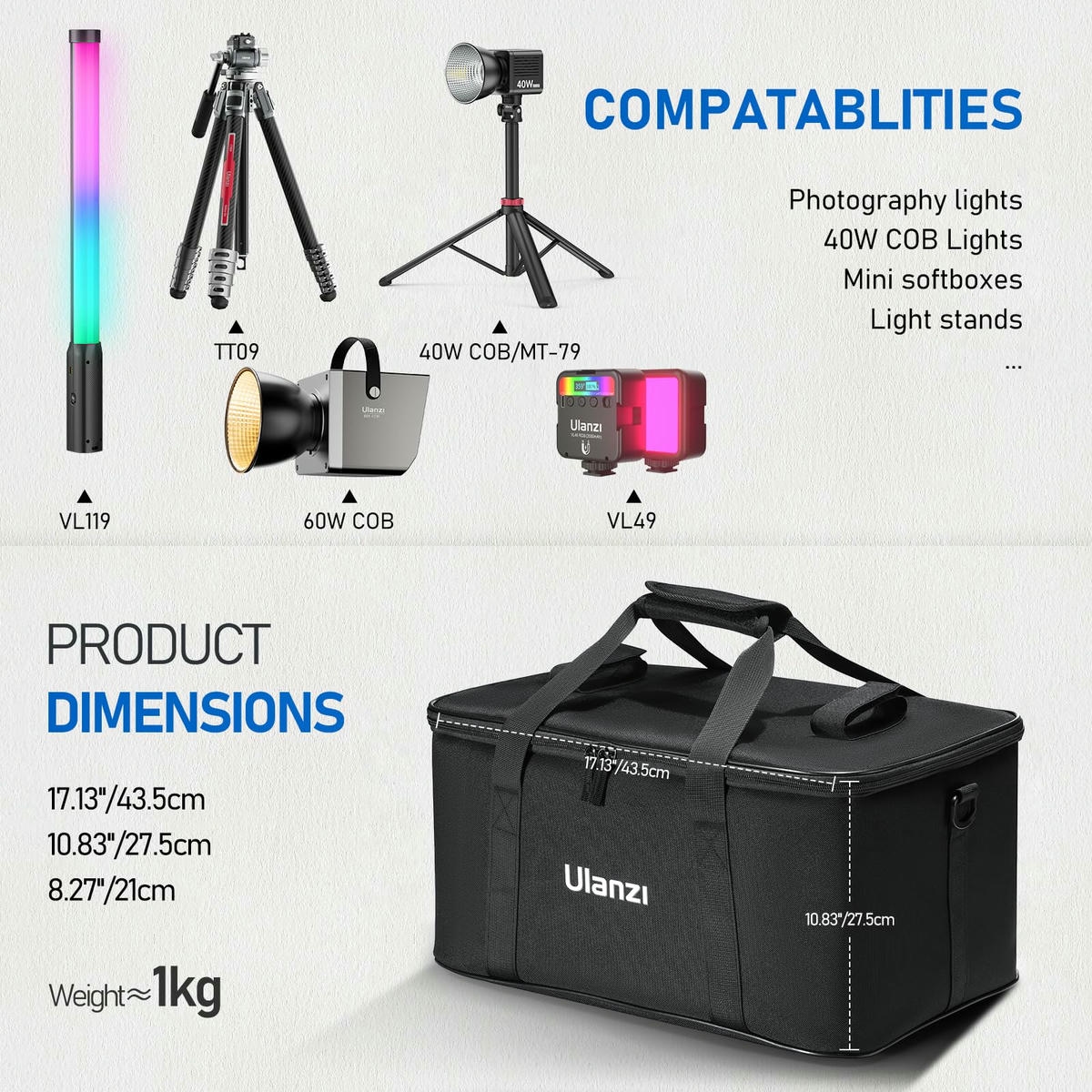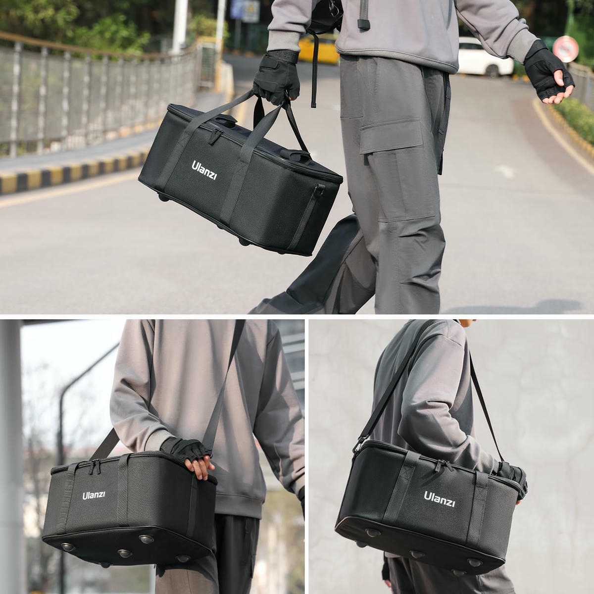 Túi đựng ULANZI OM-01 là túi du lịch/chuyển đồ cho thiết bị studio (đèn, chân đèn, softbox mini) kích thước 17.13″ x 10.83″ x 8.27″ (~43.5 x 27.5 x 21 cm). Túi làm từ vải Oxford bền, có mút lót di động để bảo vệ thiết bị, quai đeo vai và tay cầm tiện lợi.